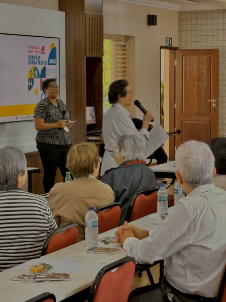 Em seguida, a Ir. Amélia de Assis Castro, Coordenadora de Equipe Inspetorial, conduziu a apresentação de um vídeo com bandeiras contendo “sinais de esperança”, enviados pelas unidades em preparação para o encontro - um gesto simbólico que expressou a caminhada conjunta da Inspetoria.