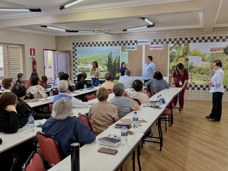 Ainda no primeiro dia, a Ir. Dircione da Glória Amorim, Coordenadora de Ação Social, conduziu o momento de aplicação da Matriz SWOT (Forças, Fraquezas, Oportunidades e Ameaças) - ferramenta clássica de planejamento estratégico criada por Albert Humphrey, nos anos 1960.