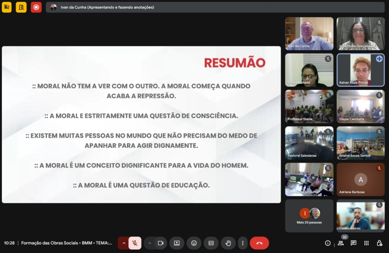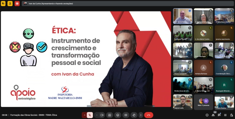 No dia 31 de outubro, a Coordenação de Ação Social da Inspetoria Madre Mazzarello-BMM promoveu uma formação on-line com as Equipes das Obras Sociais, refletindo sobre o tema “Ética: instrumento de crescimento e transformação pessoal e social”, conduzida por Ivan da Cunha. Participaram do encontro 14 Obras Sociais, totalizando 127 integrantes das equipes, que se reuniram em um ambiente de aprendizado, troca e espiritualidade salesiana.