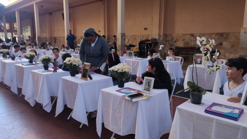 Quando entrei no pátio, por volta das três da tarde, por um momento pensei estar em uma escola de hotelaria… Na realidade, eram as crianças do segundo ano que, por ocasião do centenário da escola, quiseram escrever sua própria história dentro da grande história dessa instituição magnífica. Vi-as assinarem, emocionadas, o “livro da memória” diante de pais e amigos - um momento docíssimo e cheio de significado.