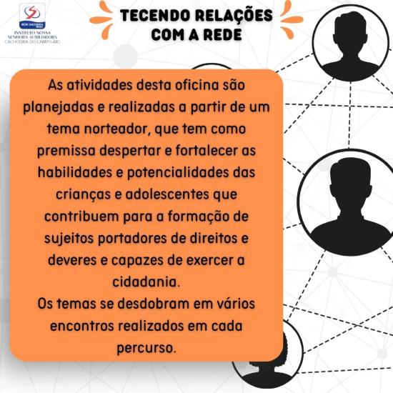 'Tecendo Relações com a Rede' A Oficina traz como objetivo fortalecer as habilidades das crianças e adolescentes, capacitando futuros cidadãos conscientes de seus direitos e deveres.