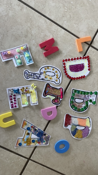 Além disso, enfeitaram letras do alfabeto com o apoio da família, promovendo a participação no processo de aprendizagem, e em sala de aula também foram realizadas atividades utilizando o alfabeto móvel, ampliando as possibilidades de exploração das letras e formação de palavras.