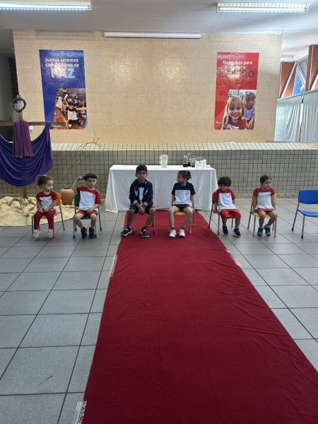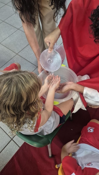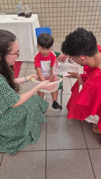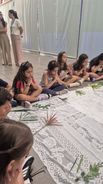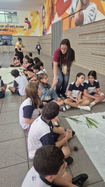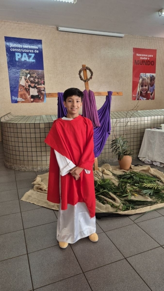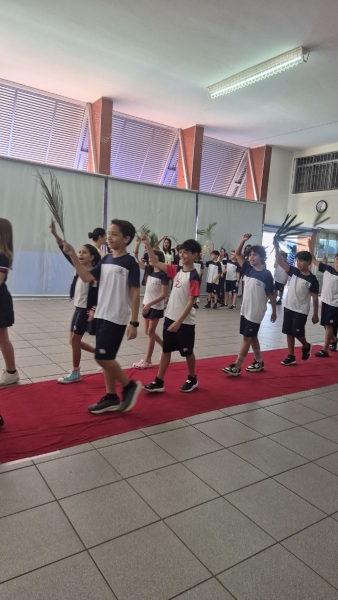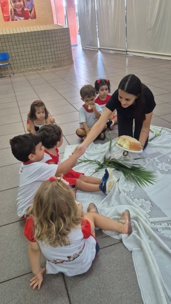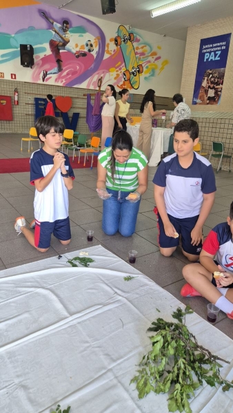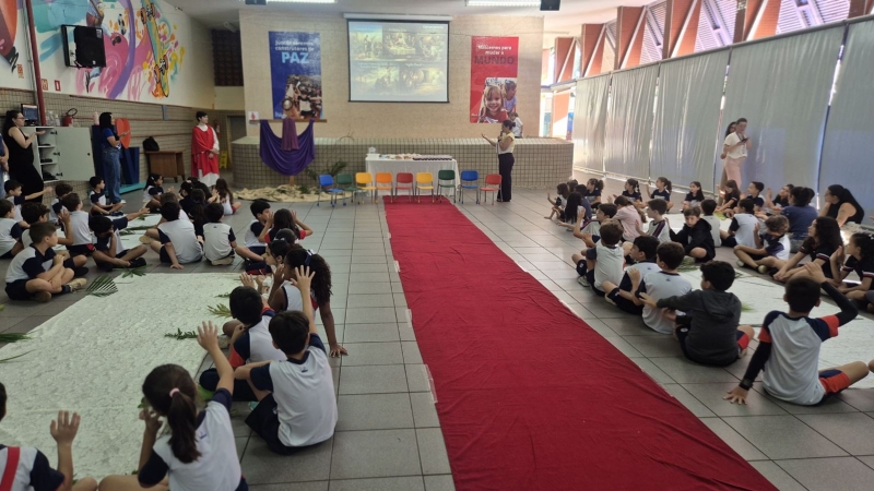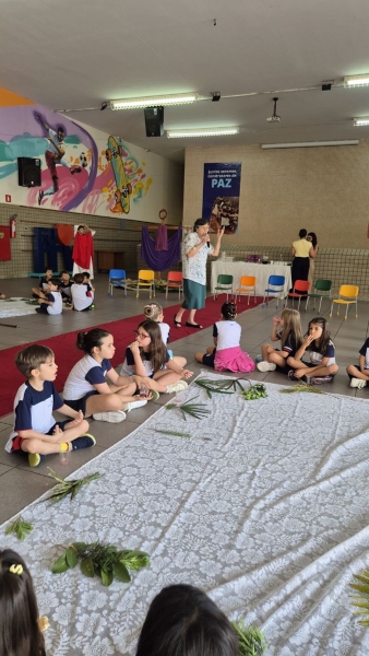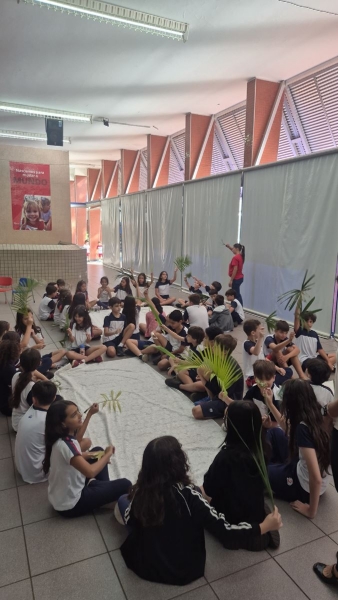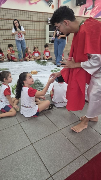 A programação teve início na segunda-feira (30), com encontros voltados à Educação Infantil e aos estudantes dos 1º anos. No período da manhã, as crianças participaram de uma vivência na área coberta da escola, marcada por momentos de oração, escuta e gestos simbólicos que ajudaram a apresentar, de maneira lúdica, o significado da Semana Santa.