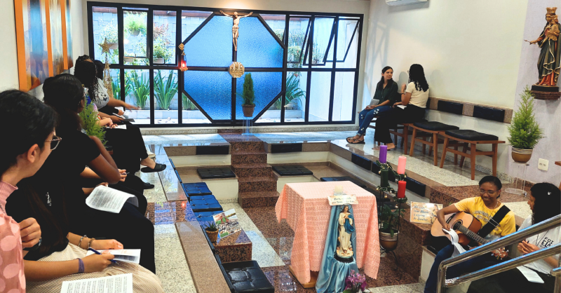 Na capela, em duplas, as participantes dialogaram sobre o que motivou cada uma a buscar o discernimento vocacional. Logo depois, Ir. Regina Carrijo aprofundou a reflexão apresentando como Madre Mazzarello viveu a esperança, mostrando trechos de filmes e propondo questões que ajudaram as jovens a reconhecer os sinais de esperança presentes em suas próprias histórias. A dinâmica levou cada participante a questionar: O que tem sustentado minha caminhada vocacional?