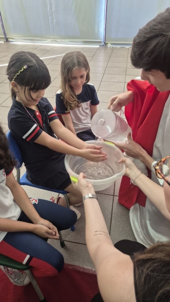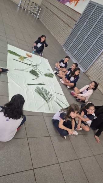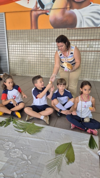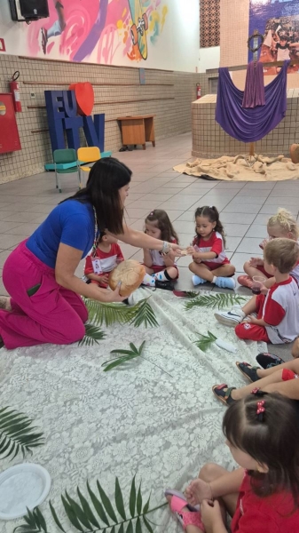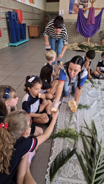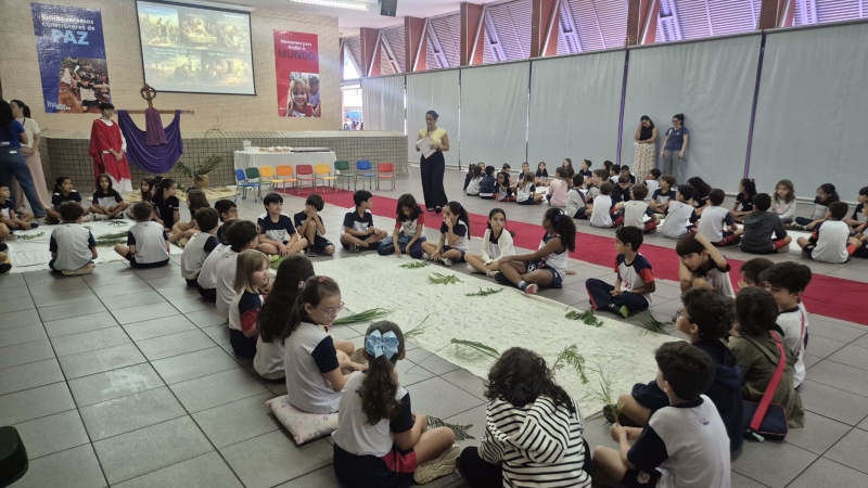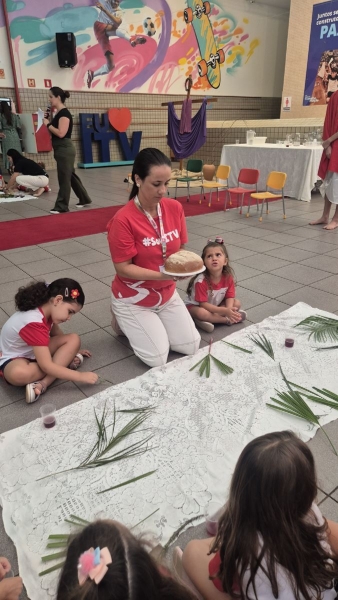 A programação teve início na segunda-feira (30), com encontros voltados à Educação Infantil e aos estudantes dos 1º anos. No período da manhã, as crianças participaram de uma vivência na área coberta da escola, marcada por momentos de oração, escuta e gestos simbólicos que ajudaram a apresentar, de maneira lúdica, o significado da Semana Santa.