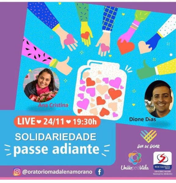 Lives e encontros virtuais aconteceram num clima de família e muita alegria. Na live “Solidariedade passe adiante”, um bate papo bem especial com o psicólogo Dione Dias que refletiu com todos o bem que a solidariedade faz. Tivemos também padrinhos S convidados que participaram e testemunharam a beleza de ter um coração solidário.